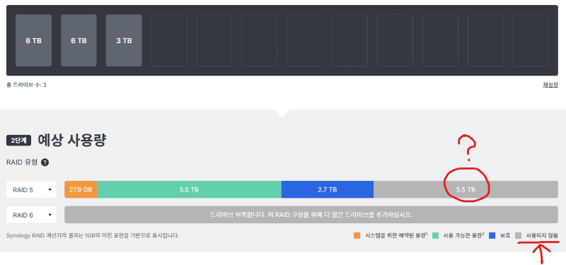 6TB 3개 혹은 6TB 4개를 써야 하는데. 3TB가 하나가 있으니 용량에 낭비가 생김.