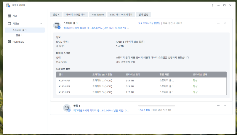 데이터 옮기고, 레이드5로 바꾸고 있는데.